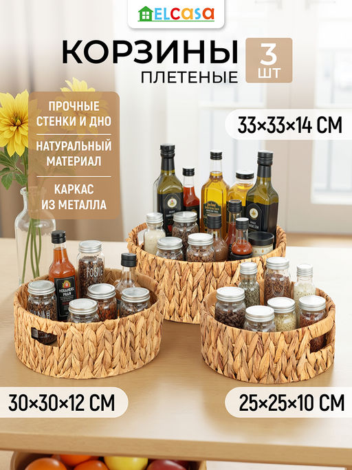 Набор 3 плетёных корзин от ELCASA предназначен для организации системы хранения вещей в вашем доме. Включает изделия разных размеров: 25х25х10 см (внутренний размер 23,5х23,5х9 см), 30х30х12,5 см (внутренний размер 28,5х28,5х11 см) и 33х33х14 см (внутренний размер 31х31х12,5 см). Прочные стенки корзинок представляют собой плетение из водного гиацинта материала, устойчивого к влаге и перепадам температур. Такое преимущество позволяет использовать органайзеры на балконе или в ванной. Благодаря элегантному дизайну и универсальной круглой форме они будут не только практичным, но и привлекательным элементом декора и стильным дополнением вашего интерьера. Эстетичные плетёные корзиночки послужат контейнерамии для хранения мелочей и аксессуаров. Поставьте их на рабочий стол дома или в офисе в качестве настольных органайзеров, компактно разместив канцелярию или документы. Подойдут для хранения принадлежностей для художника, ниток для вышивания, швейного инвентаря и других предметов для творчества. На туалетном столике используйте их под косметику, лаки для ногтей, инструменты для макияжа и маникюра. На прикроватном столике храните в них ушные палочки, ватные диски и кремы для рук. Сложите в них провода, подвески, аксессуары и принадлежности для рукоделия. Прочные ручки помогут удобно переносить даже наполненные изделия. Корзиночки с экзотичным и натуральным дизайном преобразят интерьер кухни или гардеробной. Они послужат уникальным декоративным дополнением вашей квартиры или дома. В коллекции бренда ЭЛЬКАСА представлены разнообразные товары для дома, которые привнесут в ваш быт практичности и стиля.