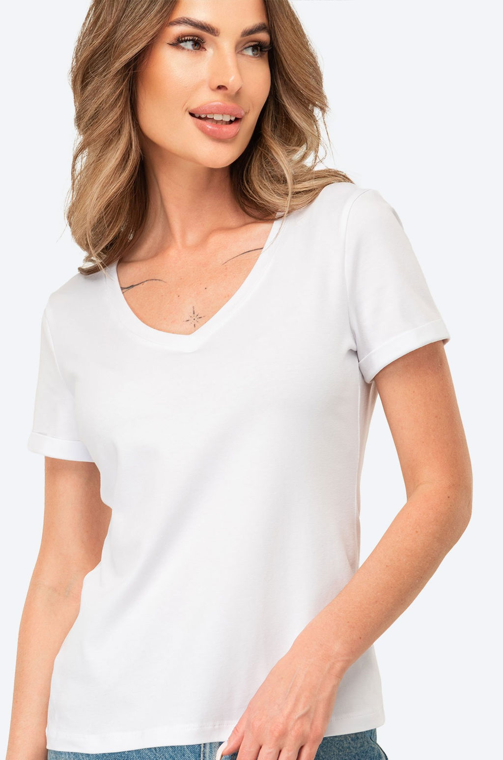 Состав: 92% хлопок, 8% эластан Фуллайкра 200 г/м2. Страна: Узбекистан. Элегантная база для идеального образа на каждый день! Белая женская футболка с V-образным вырезом подчеркнёт область декольте. Полуприталенный крой создает утончённый и женственный силуэт. На рукаве небольшой отворот маленькая деталь, дополняющая образ.