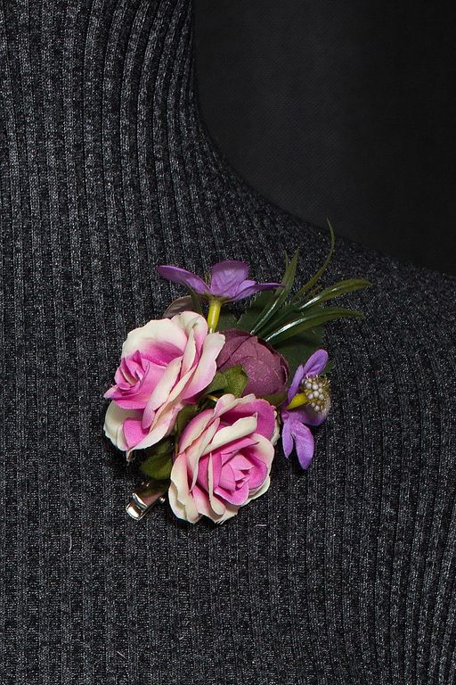 Цветочные композиции прочно поселились в летнем женственном гардеробе. Привлекающий внимание аксессуар - букетик роз светлого желтого и сиреневых оттенков.