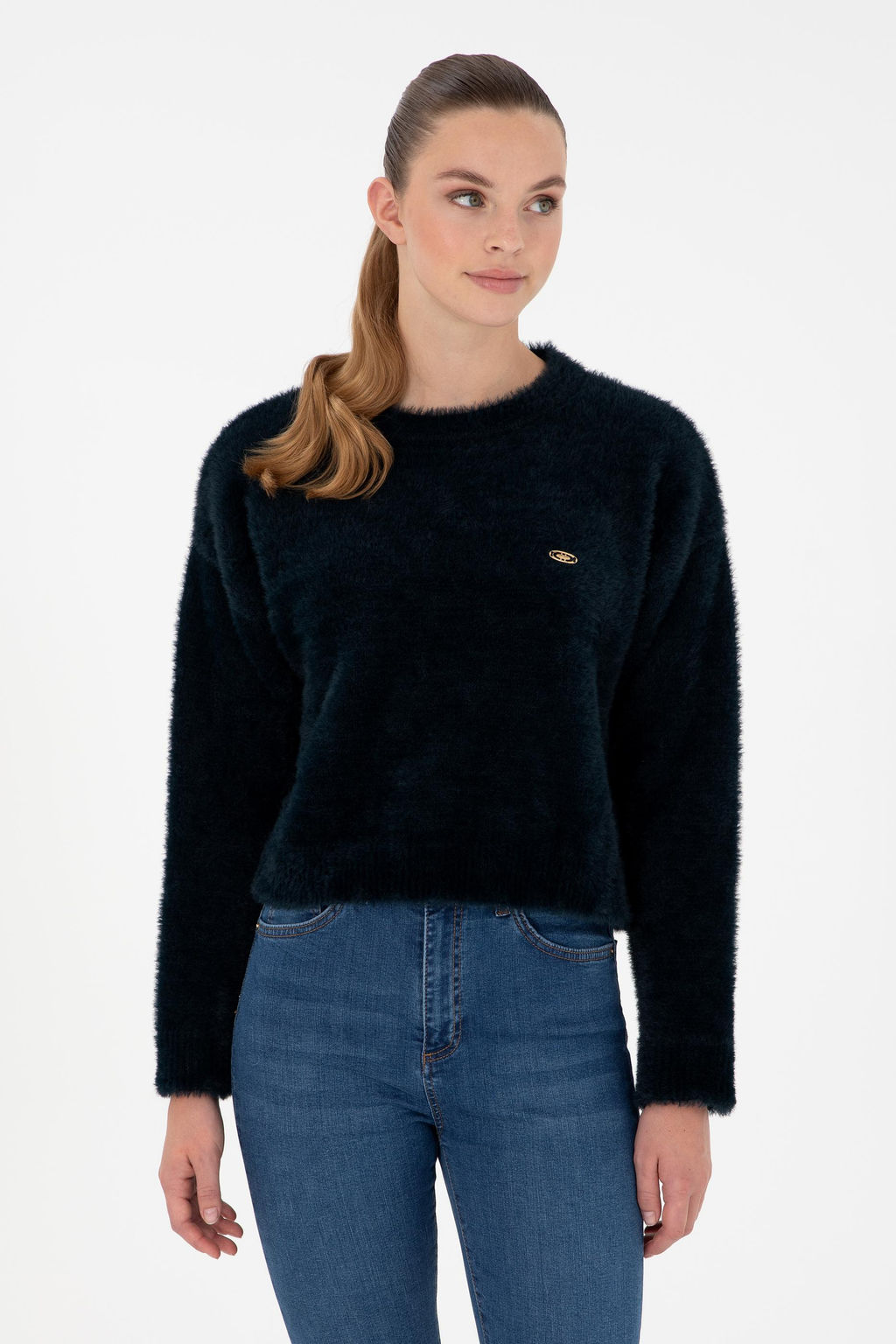 Женский темно-синий свитер с круглым вырезом и мягкой текстурой
