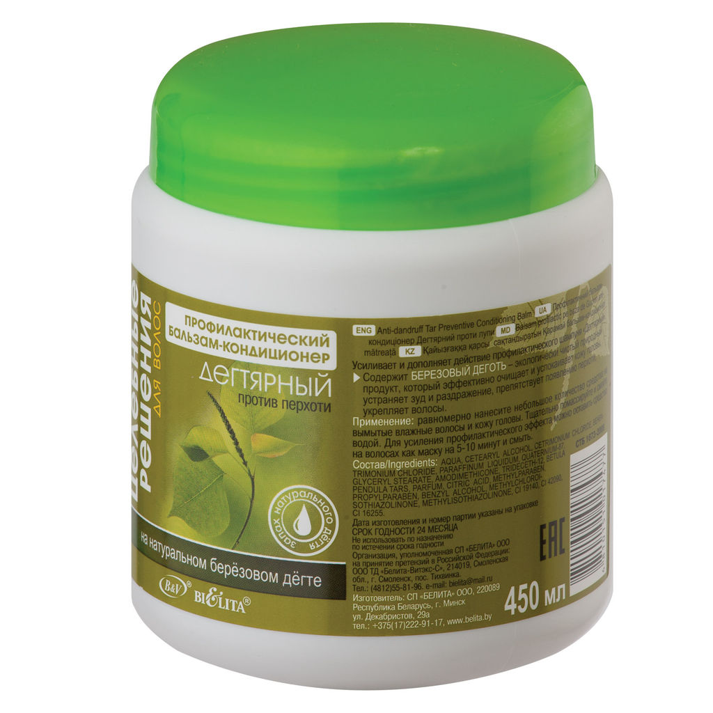 Профилактический БАЛЬЗАМ-КОНДИЦИОНЕР против перхоти Дегтярный Ваш идеальный натуральный помощник в борьбе с перхотью и сухостью кожи головы. Содержит берёзовый дёготь, поэтому имеет запах натурального дёгтя.