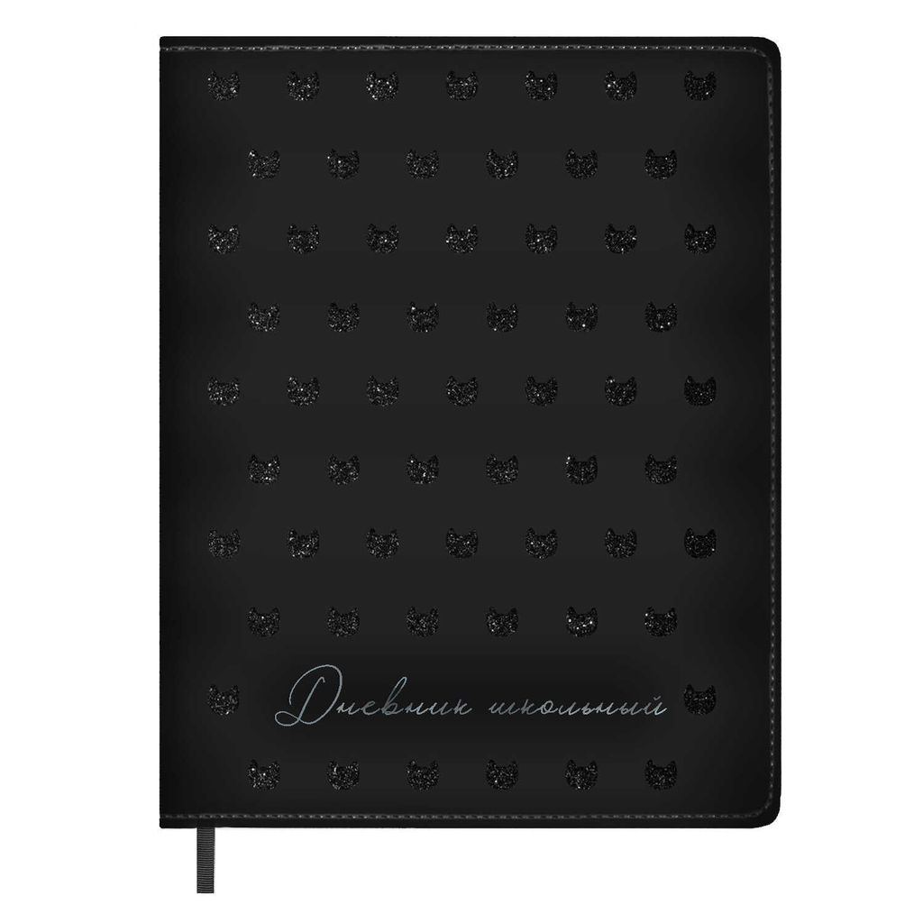 Дневник школьный арт. 72460 / 15 КОТИКИ НА ЧЁРНОМ (кожзам: А5+; твёрдый переплёт с поролоном, материал обложки: искусственная кожа "Софт-тач"; декор: перфорация + глиттерная подложка; способ крепления блока: ниткошвейный; вн. блок: 48 л., белый офсет 80 г/м?, печать в одну краску, справочный материал: универсальная шпаргалка; отделка среза: фольгирование; закладка: одно ляссе; форзац: печать пантоном; индивидуальная упаковка: ПЭТ-пакет)