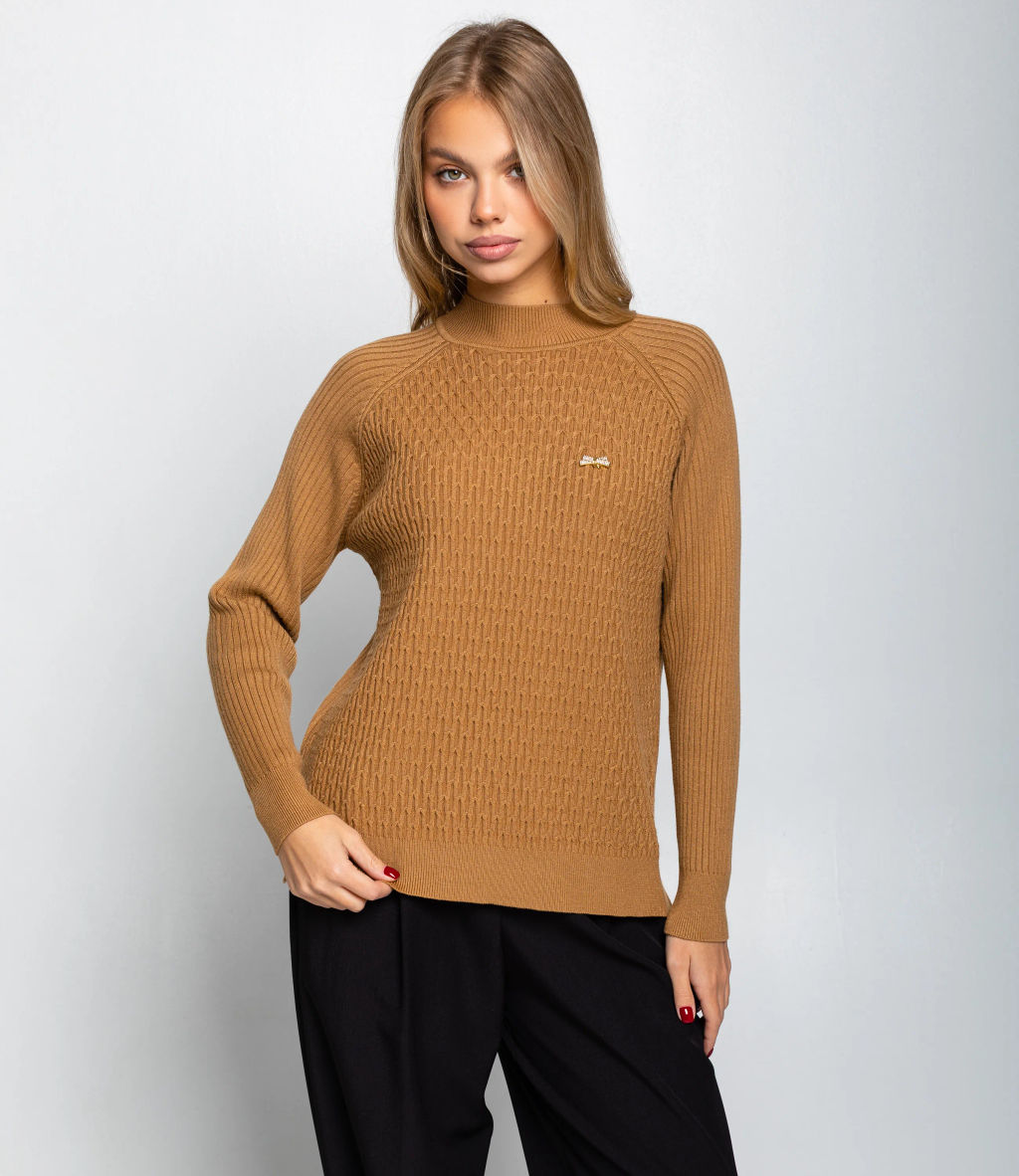 Джемпер это часть гардероба, которая подчёркивает женственность и утончённость каждой покупательницы. Джемпер прямого силуэта средней длины, чуть ниже линии бёдер, с небольшой втачной горловиной?стойкой средней высоты, выполненный из равномерного трикотажного полотна средней плотности с тонкой фактурной структурой резинка в центральной части и гладкой чулочной вязкой по рукавам; плечи оформлены со вставкой реглан, рукава длинные, зауженные к манжетам, манжеты и плотная нижняя кромка связаны мелкой резинкой, плотно удерживающей форму, боковые швы аккуратно обработаны, на одной стороне груди декоративный металлический значок небольшого размера. Для пошива использована ткань 65% хлопок, 30% полиэстер, 5% эластан. Материал устойчив к частым стиркам, не деформируется и долго сохраняет презентабельный вид, что снижает процент возвратов и рекламаций при розничной продаже. Для оптовых покупателей джемпер представляет собой выгодную и оборотистую позицию: базовый и универсальный дизайн легко интегрируется в разные ценовые и стилистические решения, упрощает формирование размерного ряда и повышает оборачиваемость. Рекомендуем выкладывать модель в зонах базовых коллекций и композиций повседневный гардероб, предлагать наборы ключевых оттенков, комплекты верх + низ и кросс?селл с пальто, жакетами и юбками для увеличения среднего чека. Цвета и фактура полностью соответствуют фотографиям в карточке товара. Рост 168, 89-63-90. -- Характеристики -- Цвет: тёмно-бежевый Пол: Женский Страна производитель: Китай Сезон: Демисезон Материал: Хлопок, Эластан, Полиэстер
