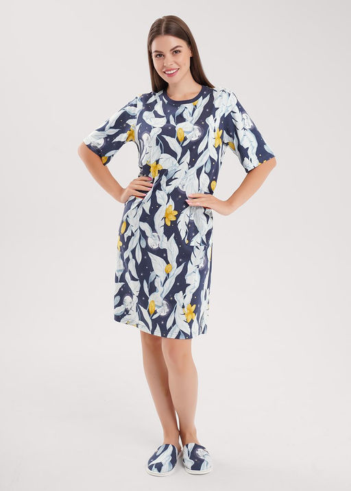 Платье прямого силуэта из хлопкового трикотажного полотна с добавлением модала. Короткий втачной рукав. Округлая горловина с обтачкой. Спереди накладные карманы с кантом. По бокам разрезы.