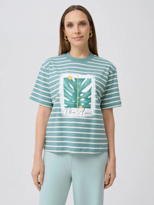 Женская футболка свободного кроя выполнена из мягкого трикотажа с высоким содержанием хлопка и добавлением эластана. Горизонтальная бирюзово-белая полоска придает образу легкость и свежесть, а контрастный принт с изображением тропического листа и надписью Mon Amour создает игривое и расслабленное настроение. Классический круглый вырез и короткие рукава обеспечивают комфорт и свободу движений.