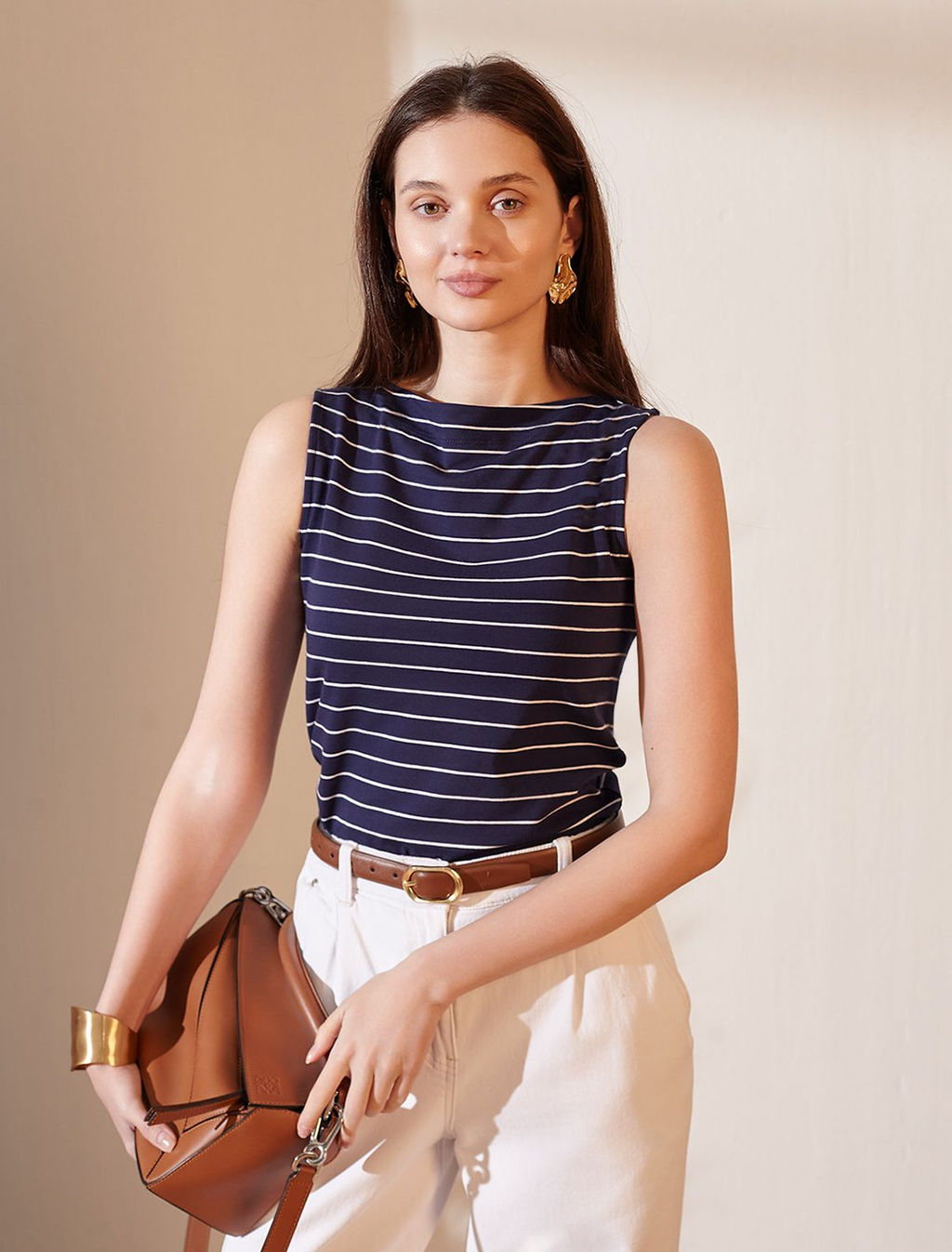 Топ темно-синего цвета в белую полоску с вырезом лодочка выполнен из премиального эластичного хлопка плотностью 170 Г/м2. Прямой силуэт подходит любому типу фигуры, в том числе и на большие размеры. Вырез лодочка придает образу изысканность и стиль. Полоска всегда актуальна и добавляет базовому топу эффектности. Благодаря тому, что материал тянется, топ хорошо садится по фигуре и обеспечивает комфорт на протяжении всего дня. Эластичное полотно мягко обхватывает силуэт, не стесняя движений. Приятный к телу хлопок не вызывает раздражения и подходит для ежедневной носки. Сочетание гладкой текстуры и эластичных свойств позволяет топу выглядеть аккуратно и стильно даже после множества стирок. Длинная майка без рукавов идеально подойдет для создания свежих и модных образов на каждый день.­