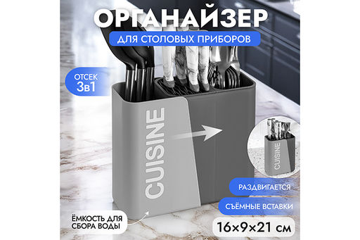 Органайзер для столовых приборов Elan Gallery "Серый" размером 16,7х9,5х21,5 см выполнен из пластика в универсальном дизайне и подойдёт к любому интерьеру. Пластиковый держатель для кухонной утвари имеет два глубоких отделения, внутренний размер каждого 8,5х8х21,5 см. В одном из отделений есть съёмный стакан размером 9х8х12 см с отверстиями на дне, во втором съёмная подставка с разделителями для хранения ножиков. Благодаря этому излишки воды будут стекать со столовых приборов в ёмкость подставки. Сушилка для кухонного инвентаря раздвигается в длину, образуя третье дополнительное отделение размером 9х7,5х21 см. Можете использовать его для организации хранения половников и лопаток. Общий размер изделия в разложенном виде 24х9,5х21,5 см. Подставка подходит для хранения ножей, вилок, ложек и других кухонных принадлежностей, обеспечивая легкий доступ и удобство использования. Раздвижной контейнер с разделителями поможет организовать удобное хранение и уместит большое количество столовых приборов. Вы можете разместить лоток на столе, раковине или в шкафу, чтобы организовать порядок на вашей кухне. Благодаря стильному дизайну позволит хранить столовые приборы даже на открытой полке. Настольная подставка подходит не только для хранения, но и сушки столовых приборов возле мойки. Поставляется в картонной упаковке. Ёмкость для приборов выполнена в универсальных серых и графитовых оттенках и поможет создать порядок и чистоту на вашей кухне. В коллекции бренда Элан Галерея представлено много функциональных товаров для дома, в том числе стильная посуда и кухонные аксессуары. Выберите варианты на свой вкус!