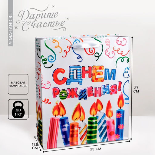 Для кого: Унисекс. Плотность, г/м²: 190. Допустимый вес вложения, г: 1000. Тематика: Праздник. Рисунок: Да. Символ года: Нет. Тематика праздника: День рождения. Отделка пакета: Ламинация. Вид ручки: Ручка-лента. Форма пакета: Вертикальный. Особенности: Без особенностей. Бесплатная доставка: Да. Наша разработка: Да. Размеры товара: 1.5/27/23.