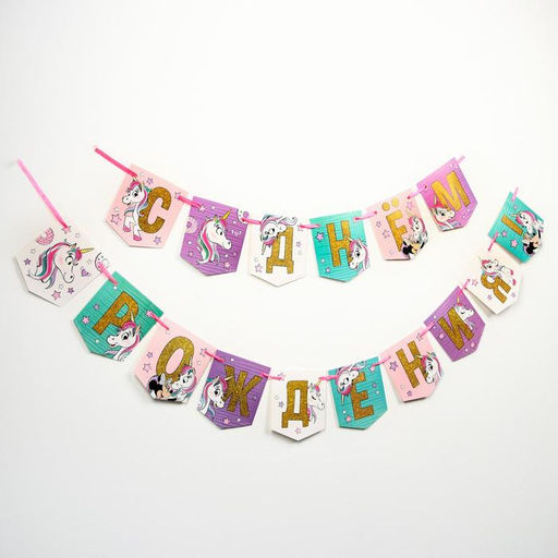 Цена за 2 шт. Гирлянда на ленте «С Днем Рождения!», длина 215 см, Минни Маус и Единорог