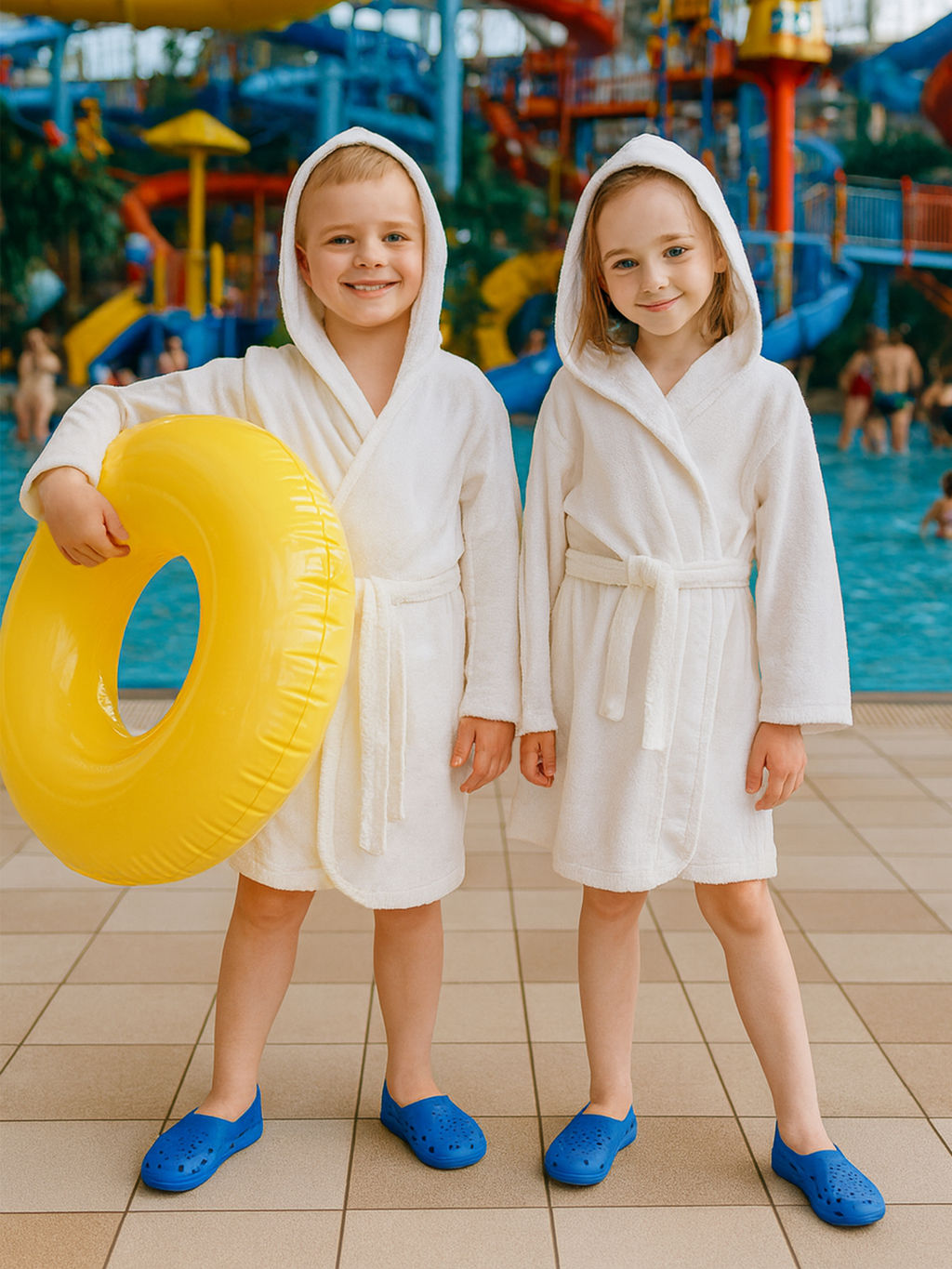 Очень милый халат из махры с капюшоном однотонного молочного цвета. Халат идеально подходит для деток, любящих купаться, так как сшит из ткани, которая, наряду с прочими достоинствами, хорошо впитывает влагу. Пояс вставляется в петельки по бокам и удобно фиксирует халатик.