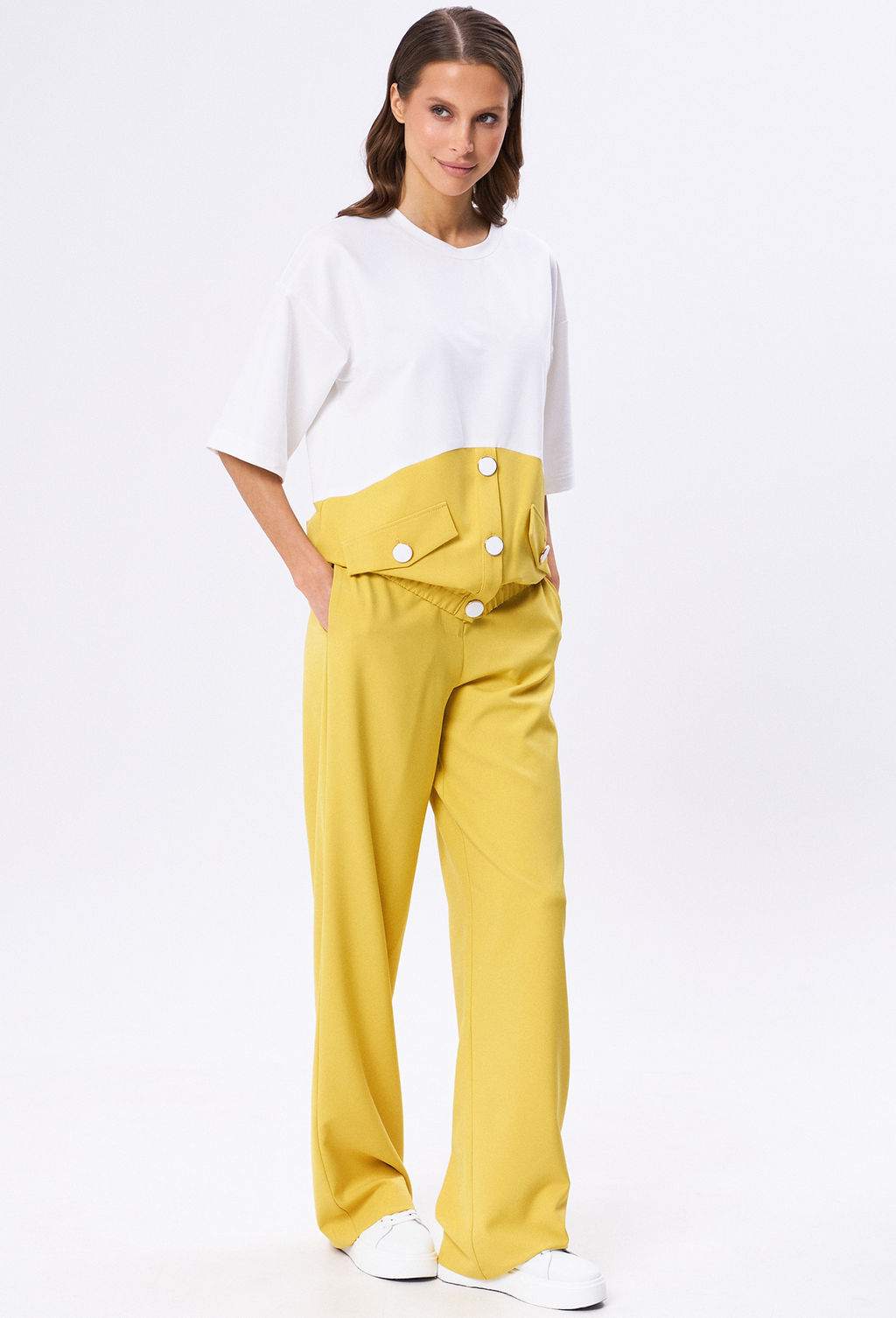 Комплект, состоящий из блузки и брюк. Объёмная блузка на резинке по низу выполнена из футера 2-х нитки в сочетании с костюмной тканью. Линия плеча спущена, рукав до локтя. По переду в качестве декора клапаны с пуговицами. Прямые брюки из костюмной ткани частично на резинке по поясу с застёжкой на гульфик с молнией и пуговицу. По бокам карманы.