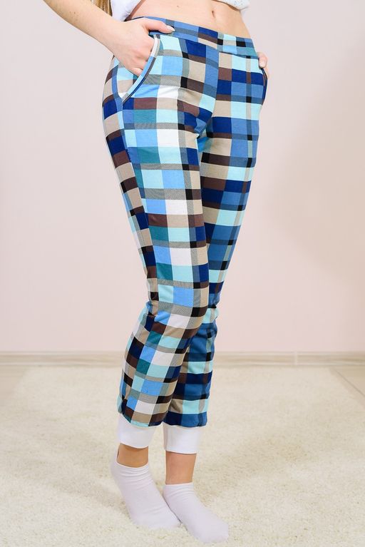 Описание модели: Брюки женские из набивной кулирной глади с притачным поясом на резинке, боковыми карманами, вход в карман окантован в цвет брюк. Низ на манжете из гладкокрашеной рибаны с лайкрой.