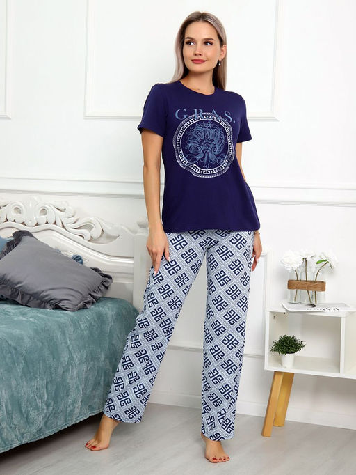 Костюм женский домашний состоит из футболки и брюк . Футболка свободная, длиной до линии бедер, плечо спущенное , рукав втачной короткий. Горловина с обтакой. На середине переда оригинальный принт . Брюки длинные , свободные без карманов. Пояс на резинке.
