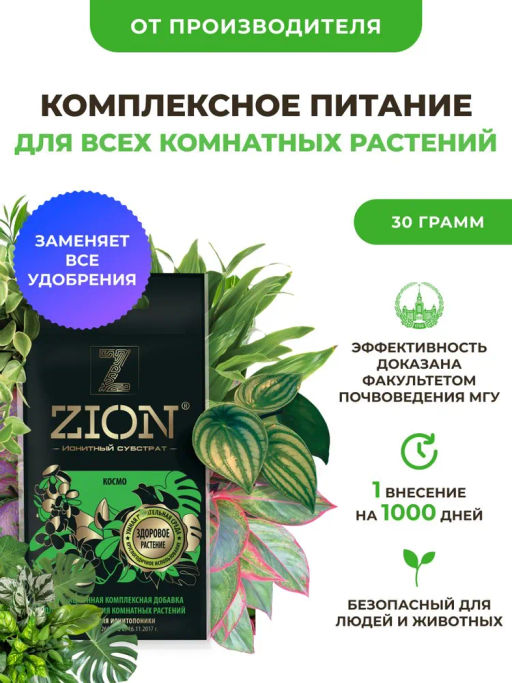 Ионитный питательный субстрат ЦИОН КОСМО создает и поддерживает оптимальные условия для гармоничного роста и полноценного развития декоративно лиственных комнатных растений. Способствует формированию сильной корневой системы, образованию новых побегов, ярких блестящих листьев, восстановлению поврежденных растений. ЦИОН может использоваться как самостоятельно, так и в виде корректирующих добавок к любой основе (посадочному грунту). Ионитный субстрат ЦИОН КОСМО может быть использован для обеспечения растения сбалансированным набором элементов питания на любом этапе его жизненного цикла. В течение периода полезного действия ЦИОНа никаких дополнительных подкормок растению не потребуется.