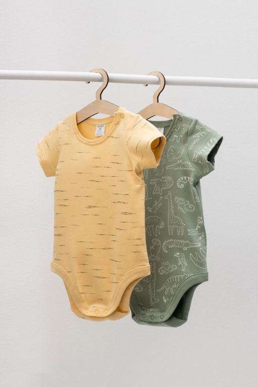 Боди в упаковке 2 шт для новорожденных из мягкого, эластичного трикотажа произведенного из натурального хлопка. Изделие застегивается на кнопки. Оригинальная набивка выполнена из стойких, гипоаллергенных, текстильных красителей. Все трикотажные полотна производятся в соответсвии с нормами Швейцарского сертификата ЭкоТекс.­
