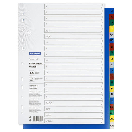 • Разделители листов А4, 20шт., алфавитные А-Я, цветные (OfficeSpace, 366053) пластик