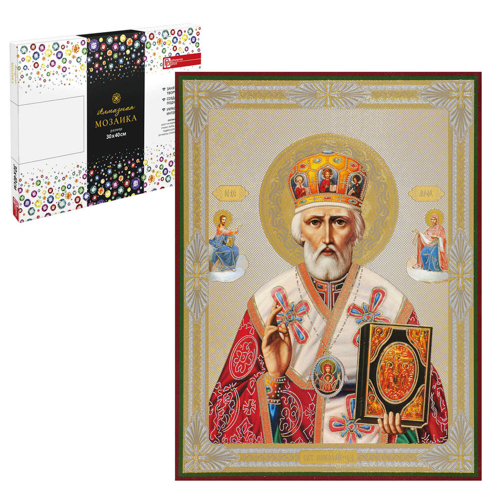 Алмазная мозаика (набор для творчества) арт. 68629 / 25 СВЯТОЙ НИКОЛАЙ, размер: 30*40 см, (28 цветов страз, холст на подрамнике с напечатанной картиной, покрытый клеевым слоем и защитной пленкой, пакеты со стразами, стилус, лоток для страз, силикон для страз, клей, подвесы для подрамника, пинцет металлический, схема, дополнительные пакеты с zip-молнией, стикеры для нумерации zip-пакетов в комплекте, форма страз: круглая, тип выкладки: полная, картонная коробка)