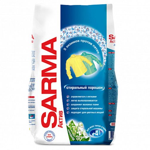 Внешний вид товара может отличаться от фотографий на сайте. Благодаря оптимальному уровню пенообразования, серия стиральных порошков САРМА Актив позволяет добиться безупречных результатов, как при ручной, так и при автоматической стирке. Порошок отлично удаляет пятна от чая, кофе, шоколада, растительного масла, красного вина, травы, крови, делая вещи идеально чистыми, благодаря комплексу из 5-ти энзимов.