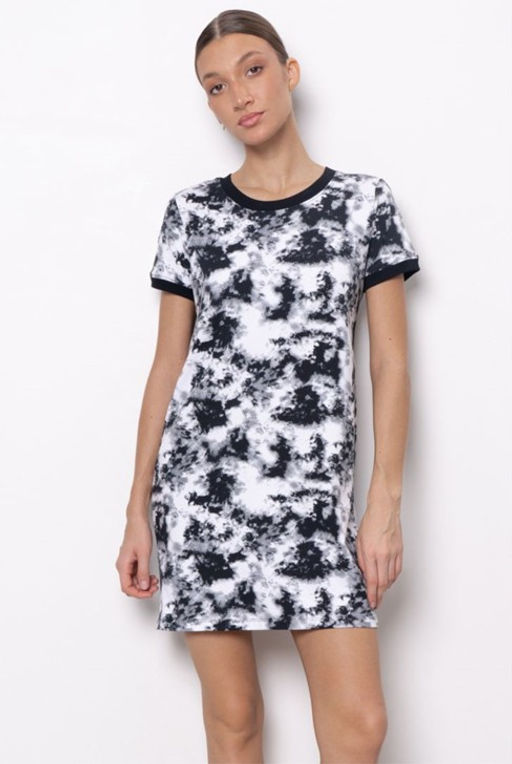Платье-футболка свободного прилегания с коротким рукавом. Вырез горловины круглый. Модель декорирована брендовой нашивкой. Платье в черном исполнении декорирована тематическим принтом. Модель уместна как для дома, так и для летних прогулок.