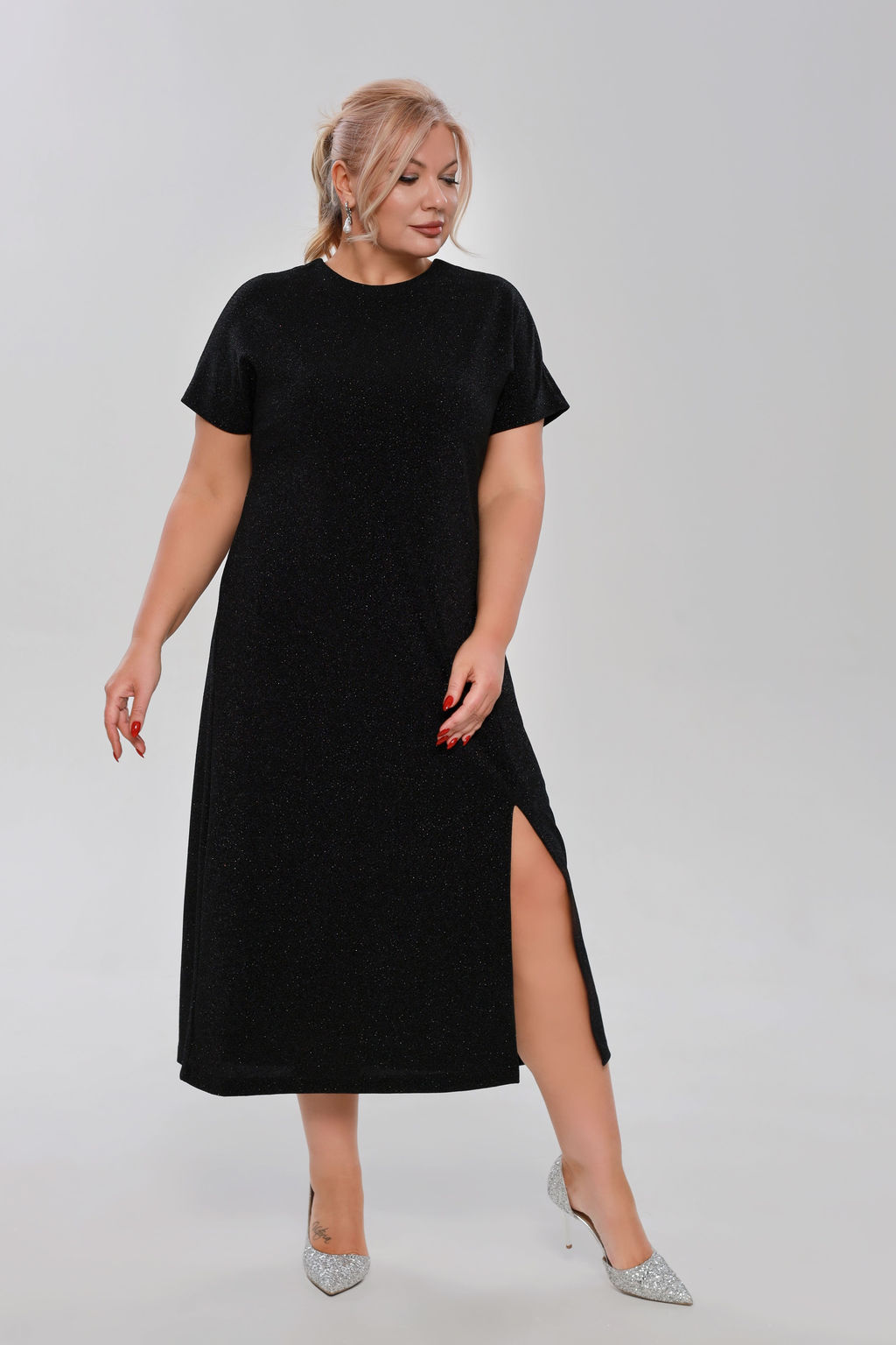 Платье с люрексом с разрезом сбоку черное