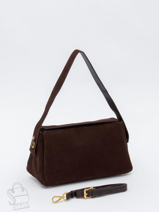Трендовая модель, выполнена из замши. Дополнена золотистой фурнитурой. Данная модель закрывается на клапан, носится в руке за встроенную ручку или на плече. В комплекте имеется съемный ремень с регулировкой длины. Каркас полужесткий. На дне предусмотрены ножки.