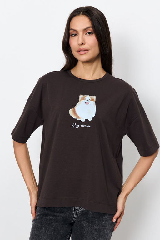 Футболка свободного силуэта из хлопкового эластичного полотна. Свободный силуэт со спущенной линией плеча и коротким рукавом. Круглый вырез горловины оформлен бейкой.