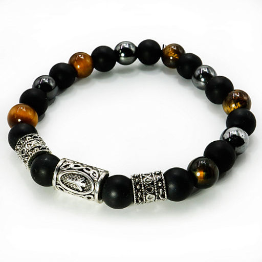 Браслет украшен тщательно подобранными натуральными камнями, каждый из которых обладает своими уникальными свойствами. Например, шунгит и гематит защищают от негативной энергии, а соколиный глаз способствует успеху и процветанию. Вместе они создают гармоничное сочетание, которое усиливает защитные свойства руны Альгиз.