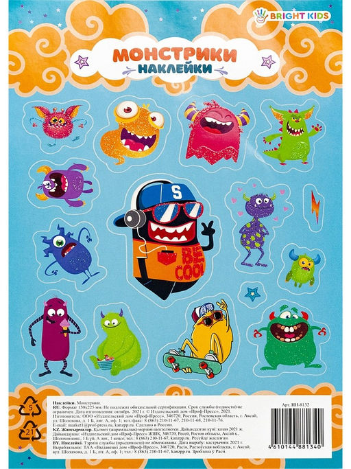 • Цена за 10 шт. Наклейки на листе А5 "Монстрики" (НН-8132) с блестками