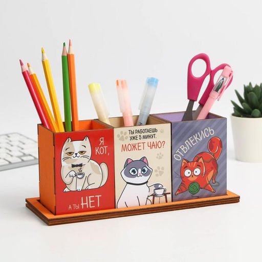Органайзер для канцелярии тройной, на подставке «Коты», 6,5 х 6,3 х 9 смНастольный органайзер для хранения канцелярии – универсальное изделие, которое поможет без лишних хлопот организовать пространство на рабочем столе. Отлично впишется в интерьер и позволит сделать вашу работу максимально продуктивной, ведь удобное рабочее место – залог успешной деятельности. А еще подобный органайзер станет отличным подарком для людей, которые ценят практичные презенты и любят порядок во всем. Набор: Нет. Возраст: От 3 лет. В наборе, шт.: 1. Количество секций: 3. Рисунок: Да. Тематика праздника: Универсальная тематика. Тематика праздника: 1 Сентября. Тематика конструктора: Животный мир. Назначение: Для канцтоваров. Назначение: Универсальные. Особенности: Открытый. Поставляется в разобранном виде: Нет. Бесплатная доставка: Да. Наша разработка: Да. Примечание: Изделие поставляется в разобранном виде. Для лучшей фиксации деталей используйте клей..