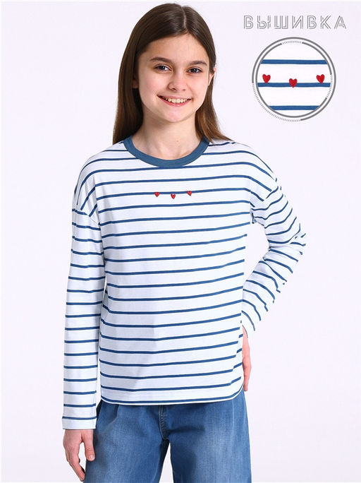 Уценка -70% лонгслив,хлопок 100%,кулир / хлопок 100%,- / полоска белый 22+синий 5+темно-голубой325 / Три сердечка вышивка / - / - / -,Лонгслив для девочки выполнен из кулира легкого хлопкового набивного плотна. Изделие прямого силуэта и свободного кроя, с длинными рукавами со спущенной линией плеча, вырез горловины обработан эластичной бейкой из полотна компаньона, украшено акуратной вышивкой. Уход: только машинная стирка (руками не стирать!) при температуре 40 градусов, без предварительного замачивания. Изделия с вышивкой перед стиркой необходимо вывернуть на изнаночную сторону.