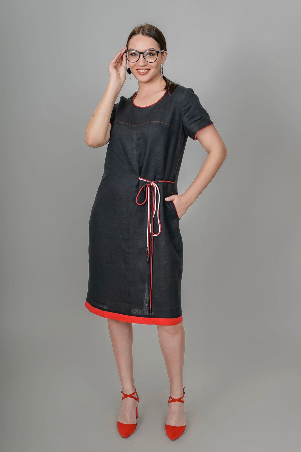 Льняное летнее платье-футляр с рукавом. Несмотря на офисный стиль, модель уместна и в повседневной жизни. Завязки могут служить как декором, так и пояском, с помощью которого возможно приталить платье. Имеется один боковой карман в шве. Модель, благодаря конструкции, отлично подходит для фигур большой полноты.