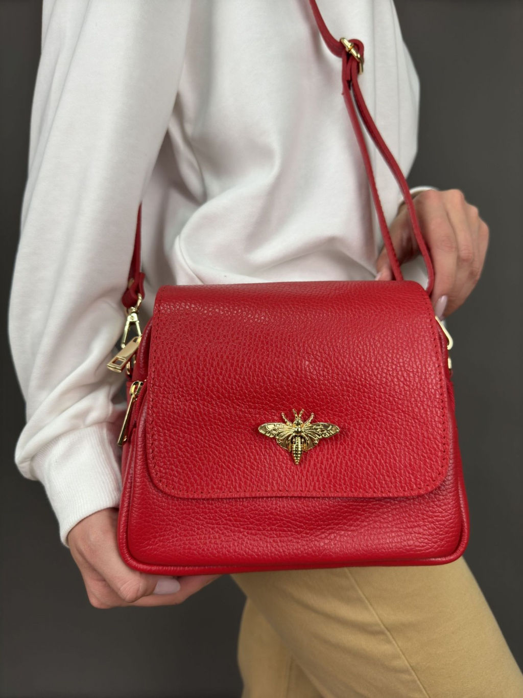 Страна: Италия Акции: Товары со скидкой Производитель: Pelletteria Luisa, Italy Размер: средняя Стиль ношения: на ремешке через плечо Форма: мягкая Выделка кожи: зернистая износостойкая Цвет кожи: Красный Оттенок: ярко-красный Упаковка: Пакет тканевый L, 40x40 см Палитра цветов: TB-105946 Dollaro Размеры: длина: 21 см \tвысота: 17 см \tширина: 10 см Описание: Небольшая, очень красивая женская кросс-боди из натуральной кожи, производство Италия. коллекция Весна-Лето, Sefaro. Золотая бабочка-застежка делает эту сумку запоминающийся и уникальной составляющей нежного женского образа. Сумочка имеет каркасную форму, выполнена из зернистой износостойкой телячьей кожи. Сочетается с вещами в стиле Casual, будет органично смотреться в классическом, либо повседневном, а также праздничном и вечернем образах. Закрывается на крышку и на молнию сверху. Внутри 1 небольшой карман на молнии. Снаружи 1 вместительный карман на молнии. Внутренняя отделка - качественная, водоотталкивающая, приятная на ощупь и долговечная в использовании, ткань. В комплекте плечевой кожаный ремешок, который регулируется по длине. Можно носить на локте, на плече и через плечо очень удобно и комфортно!