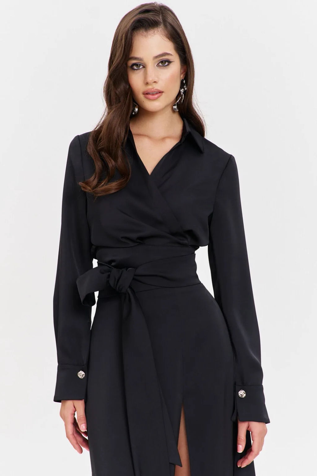 Блузка полуприлегающего силуэта, на запах, длиной до талии. Спинка с небольшой сборкой по шву притачивания к поясу. Перед с односторонними складками. По низу блузки притачной пояс с отлетными концами. Рукава одношовные, втачные, длинные. По низу рукава обработан разрез, складка и притачная манжета, которая застегивается на петлю и пуговицу. По горловине обработан рубашечный воротник на отрезной стойке. В правом боковом обработана застежка на потайную тесьму-молнию. Состав: 70% пэ, 28% вискоза,2% эластан