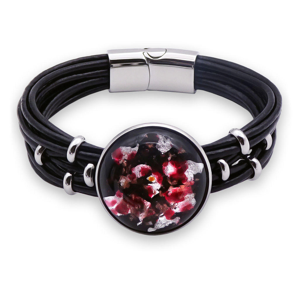 Браслет изготовлен из муранского стекла, натуральной кожи и гипоаллергенной ювелирной стали, что очень важно для людей с чувствительной кожей. Металл не темнеет и не подвергается воздействиям окружающей среды, надолго обеспечивая красивый внешний вид изделия. Крепкий магнитный замок с двойной защитой надежно фиксируется на запястье. Ширина браслета - 1,5 см. Диаметр стеклянного элемента - 2,5 см. Вес - 23 гр.