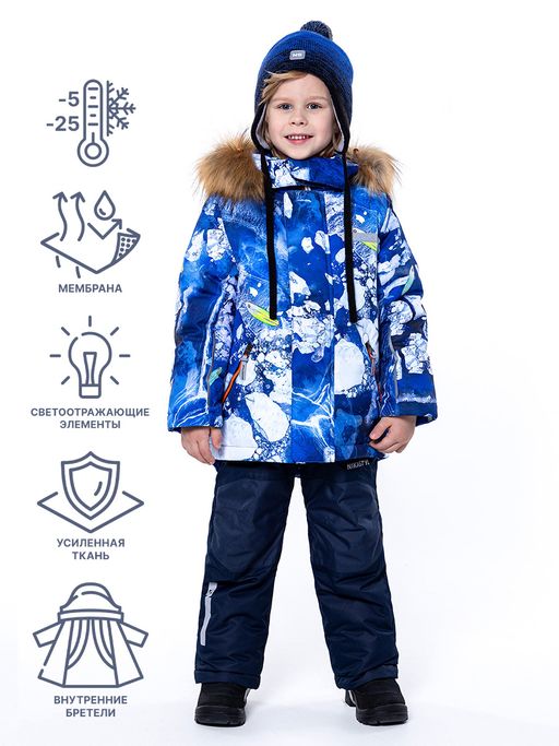 Ткань верха: МЕМБРАНА BREATEX Teflon 5000/5000 (100% полиэстер) Подкладка: флис + п/э (100% полиэстер) Температурный режим: от 0С до -25С Утеплитель: верх fiberlite 250 /низ fiberlite 150 (100% полиэстер) Мех опушки: искусственный Костюм Океан   из мембранной ткани 5000/5000 с водо- грязеотталкивающей технологией TEFLON. Мембранная ткань это непродуваемый и водонепроницаемый материал, который надежно защищает от ветра и влаги. Благодаря дышащим свойствам мембраны ребенку будет комфортно в любую погоду, и он не вспотеет. Ткань обработана снаружи экологически чистым протектором TEFLON для защиты от воды и грязи. Мембрана в сочетании с утеплителем нового поколения FIBERlite сохраняет тепло во время прогулок, позволяя телу дышать. Флисовая подкладка отводит влагу и имеет хорошие теплоизоляционные свойства.Функционал:  центральная застежка и  карманы на молнии,  ветрозащитная планка, съемный капюшон и меховая опушка  на молнии, кулиса для регулировки объема по капюшону и  по низу куртки ,  мягкие  трикотажные  манжеты в рукавах ,  внутренняя бретель для возможности снять куртку в помещении. Мы все продумали до мелочей, поэтому брюки  дополнительно оснащены регулируемыми бретелями и отстегивающейся спинкой, с удобными карманами. Средний шов, шаговый и швы в области колен проклеены,  места повышенного трения выполнены из особо прочной ткани , снегозащитные муфты, силиконовые штрипки, флисовая подкладка до середины бедра , светоотражающие  элементы для безопасности ребенка в темное время суток. Комфортная температура эксплуатации от 0 до -25 С. Рекомендуем приобрести комплектом аксессуары, обувь и другие вещи из капсулы в карточке товара, которые отлично сочетаются с изделиями коллекции.
