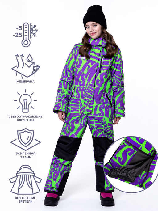 Ткань верха: МЕМБРАНА BREATEX Teflon 5000/5000 (100% полиэстер) Подкладка: флис + п/э (100% полиэстер) Температурный режим: от 0С до -25С Утеплитель: fiberlite 250 (100% полиэстер) Мех опушки: без опушки Комбинезон ГРАФФИТИ из мембранной ткани 5000/5000 с водо- грязеотталкивающей технологией TEFLON. Мембранная ткань -это не продуваемый и водонепроницаемый материал, который надежно защитит от ветра и влаги. Благодаря дышащим свойствам мембраны ребенку будет комфортно в любую погоду, и он не вспотеет. Ткань обработана снаружи экологически чистым протектором TEFLON для защиты от воды и грязи. Мембрана в сочетании с утеплителем нового поколения FIBERlite сохранит тепло во время прогулок, позволит телу дышать.  Флисовая подкладка отводит влагу и имеет хорошие теплоизоляционные свойства.   Функционал: центральная застежка и  карманы на молнии, ветрозащитная планка, съемный капюшон на молнии, кулиса для регулировка объема, карман на рукаве под ски-пасс, внутренние бретели для возможности снять верхнюю часть изделия в помещении. Мы все продумали до мелочей, поэтому модель дополнительно оснащена мягкими трикотажными манжетами в рукавах, флисовая подкладка до середины бедра, область колен и шов сидения проклеены, места повышенного трения выполнены из усиленной ткани, снегозащитные муфты на брючинах, регулировка объема брюк под обувь на молнии, светоотражающие элементы для безопасности ребенка в темное время суток. Комфортная температура эксплуатации от 0 до -25 С. Рекомендуем приобрести комплектом аксессуары, обувь и другие вещи из капсулы в карточке товара, которые отлично сочетаются с изделиями коллекции.