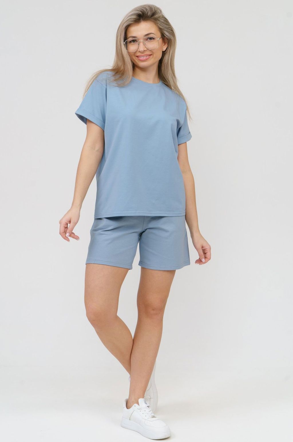 В комплекте футболка и свободные шорты. Футболка с коротким рукавом с подворотом. Шорты с поясом на резинке.