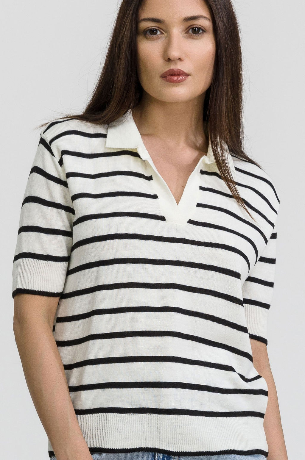 Женский джемпер в полоску стильный вариант для ежедневных аутфитов. Отложной воротник в стиле поло отлично впишется в офисные луки, V-образный вырез подчеркнет хрупкость и женственную шею.