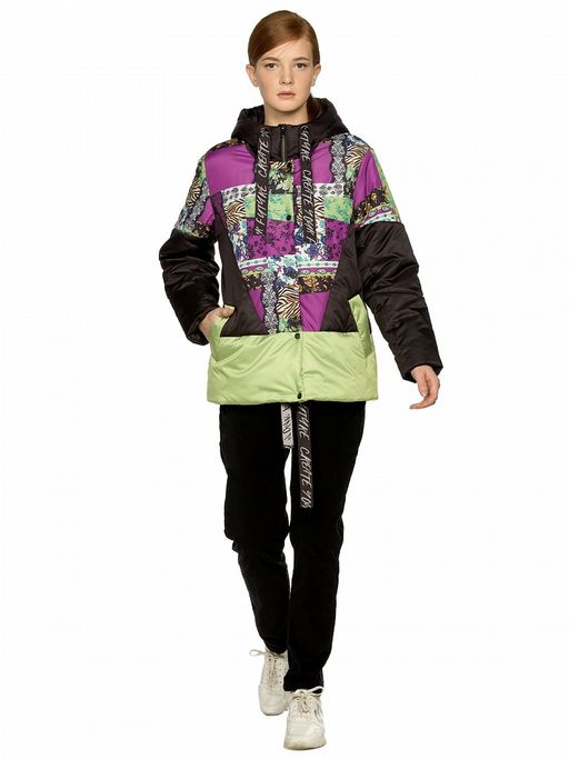Куртка женская. Новинка. Объемная, прямая и укороченная куртка. Рекомендуемый температурный режим не ниже 15С. Двойная застежка молния и кнопки. Выполнена в эклектичной стилистике. В кулиске капюшона и по низу изделия широкая репсовая лента с крупным шрифтом. Прорезные карманы с листочкой. Курточная ткань с водоотталкивающим покрытием.