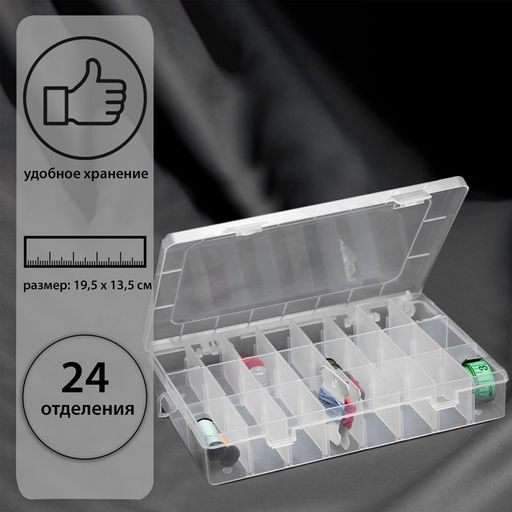 • Органайзер для рукоделия, со съёмными ячейками, 24 отделения, 19,5 × 13,5 × 3,5 см, цвет прозрачный