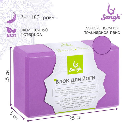 Блок для йоги, 23 х 15 х 8 см, 180 г, цвет фиолетовый