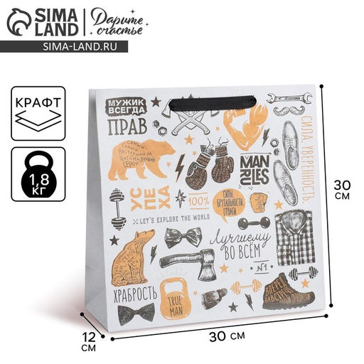 Плотность, г/м²: 150. Допустимый вес вложения, г: 1500. Тематика: Мужская. Тематика праздника: Универсальная. Отделка пакета: Крафт. Вид ручки: Ручка-лента. Бесплатная доставка: Да. Наша разработка: Да. Размеры товара: 12/30/30.