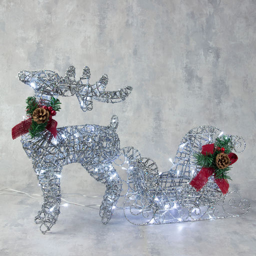 • Светодиодная фигура «Олень с санями серебристый», олень: 40 × 50 × 16 см, сани: 40 × 25 × 10 см, металл, 220 В, свечение белое