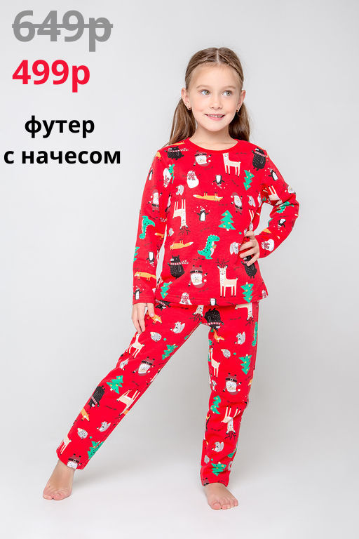 Уютная тёплая пижама для прохладных ночей. Сшита из футера с начёсом и украшена набивным рисунком. Джемпер с длинными втачными рукавами и эластичной горловиной. В поясе резинка. Брючины, рукава и низ изделия обработаны плоскими швами.