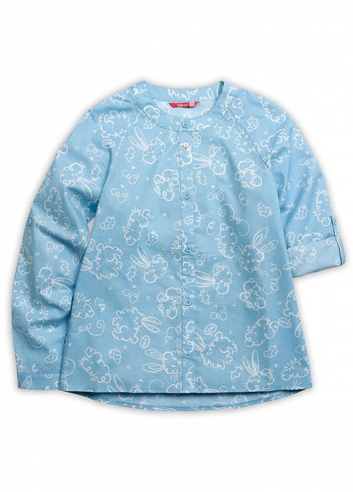 Классическая блузка в нежных девичьих цветах, по всему изделию принт - невесомые облака-зайчики. Интересное дизайнерское решение - одна пуговица по переду отличается по цвету и выполнена в форме цветочка, что придаёт изделию дополнительную изюминку. Силуэт слегка расширяется к низу, небольшой перепад длин переда и спинки. Длина рукава регулируется с помощью паты.