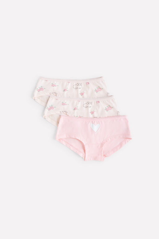 Комплект трусов для девочки. Сшиты из супрема с добавлением лайкры. В упаковке 3 штуки: светлый лосось с принтом + светлый жемчуг с набивкой. Внутри - ластовица из натурального хлопка. Пояс обработан резинкой.
