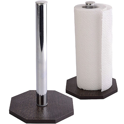 Подставка для бумажных полотенец выполнена из хромированного металла и МДФ под дерево. Круглое основание подставки устойчиво, не шатается. Подставка подходит для всех стандартных типов домашних бумажных полотенец в рулонах. За счет хромированного покрытия, изделие не будет ржаветь в условиях повышенной влажности. Стильная подставка прекрасно впишется в интерьер современной кухни.