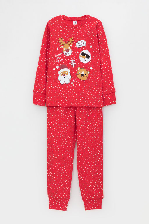 Трикотажный пижамный комплект из натурального хлопка. У джемпера длинные втачные рукава с мягкими манжетами. Брюки с удобным поясом на резинке и эластичными манжетами. Оригинальная набивка и принт выполнены из стойких, гипоаллергенных текстильных красителей. Все трикотажные полотна производятся в соответствии с нормами Швейцарского сертификата ЭкоТекс.