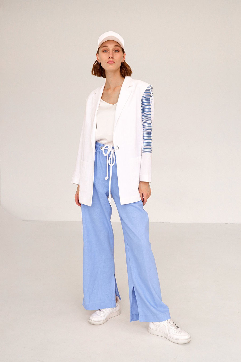 55% лен, 45% вискоза Жакет полуприлегающего силуэта с втачным двухшовным рукавом, без подкладки. Жакет с застежкой на пуговицу спереди. С воротником и лацканом. Полочка с рельефом и настрочным карманом. Спинка с рельфом, средним швом со шлицей и застежкой на петли-пуговицы по центру. По спинке и левому рукаву печать. Подборт жакета окантован.