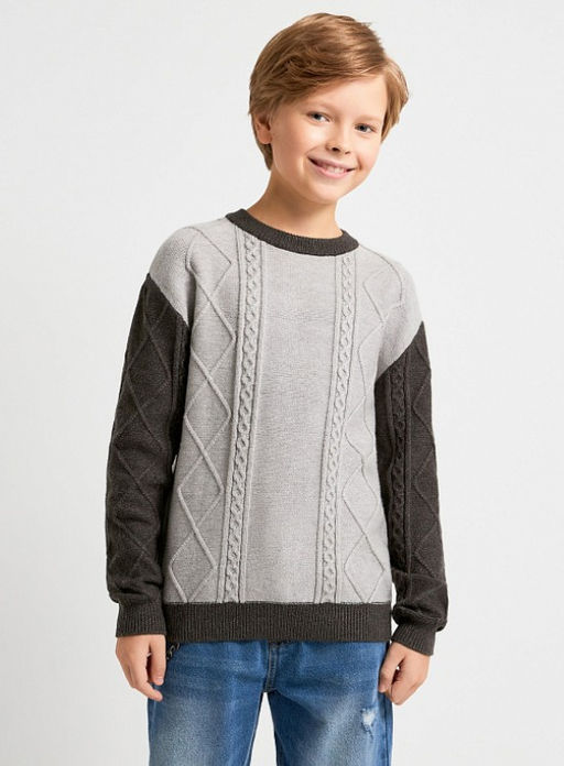 Свитер прямого кроя в стиле колор-блок с вязаным рисунком в виде кос для мальчиков. Выполнен из мягкого и износоустойчивого материала с добавлением вискозы. Округлая горловина. Рукава со спущенной линией плеча. Рельефная обвязка манжетов и нижнего края. Комфортен в повседневной носке. 51%Вискоза/26%ПЭ/23%ПА